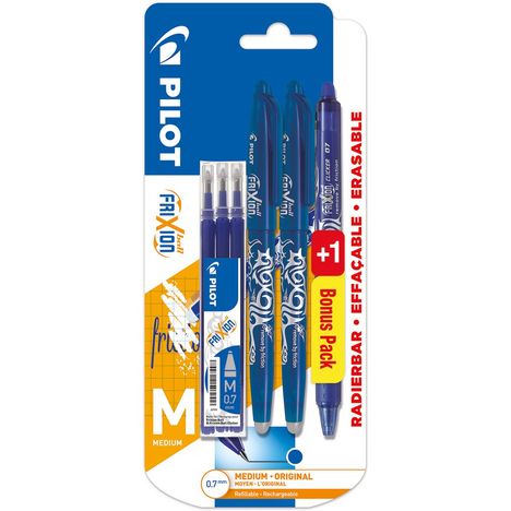2 FRIXION BALL BLEU + 1 ETUI 3 RECHARGES + 1 FRIXION BALL CLICKER 0.7 BLEU. Roller rechargeable, encre thermosensible effaçable, gomme intégrée, n'arrache pas le papier, ne laisse pas de dépôt, grip ergonomique, pointe métal, écriture moyenne. Ne pas utiliser sur documents officiels.