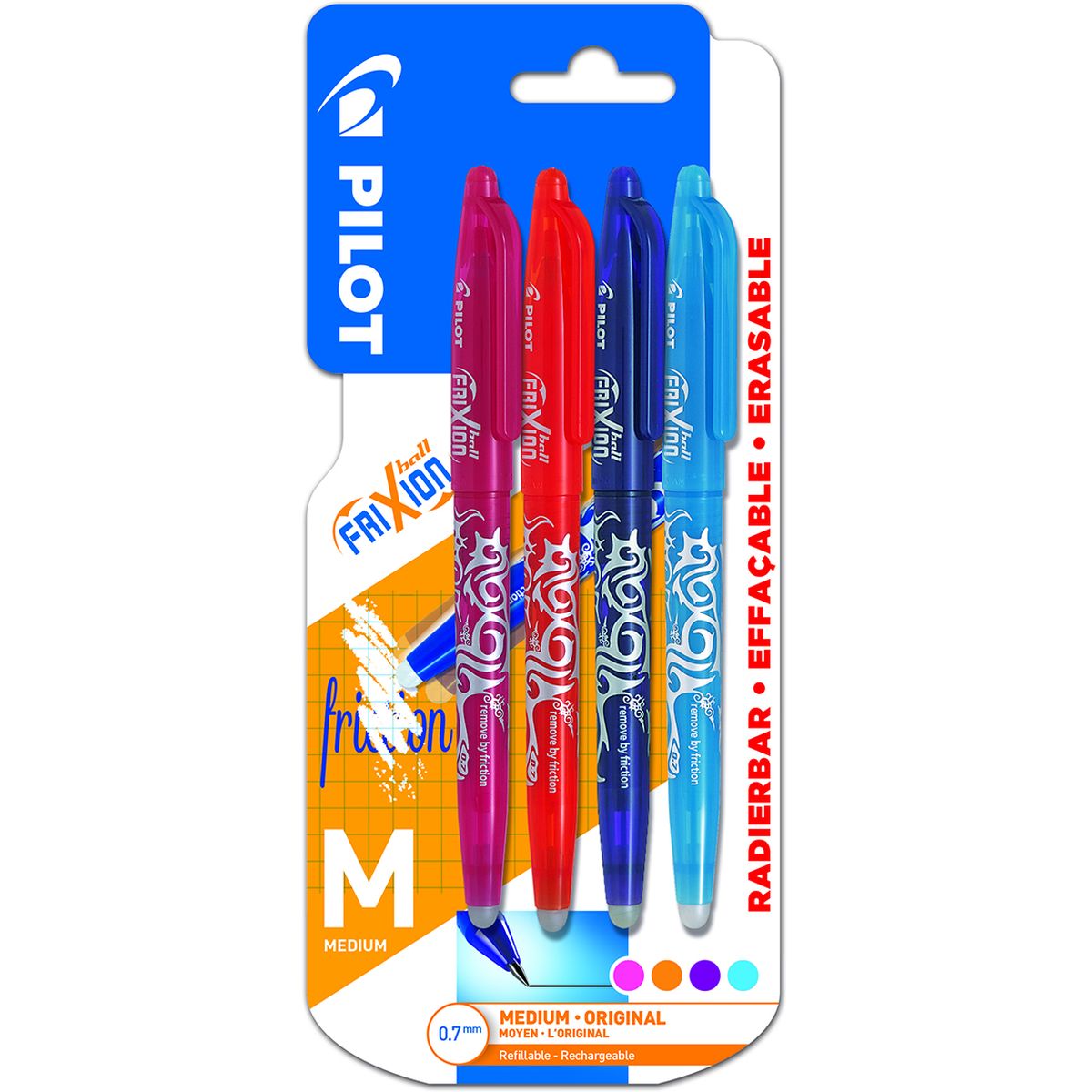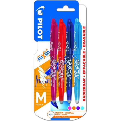 4 FRIXION BALL 0.7 FUN Orange Rose Violet Turquoise. Roller rechargeable, encre thermosensible effaçable, gomme intégrée, n'arrache pas le papier, ne laisse pas de dépôt, grip ergonomique, pointe métal, écriture moyenne. Ne pas utiliser sur documents officiels.