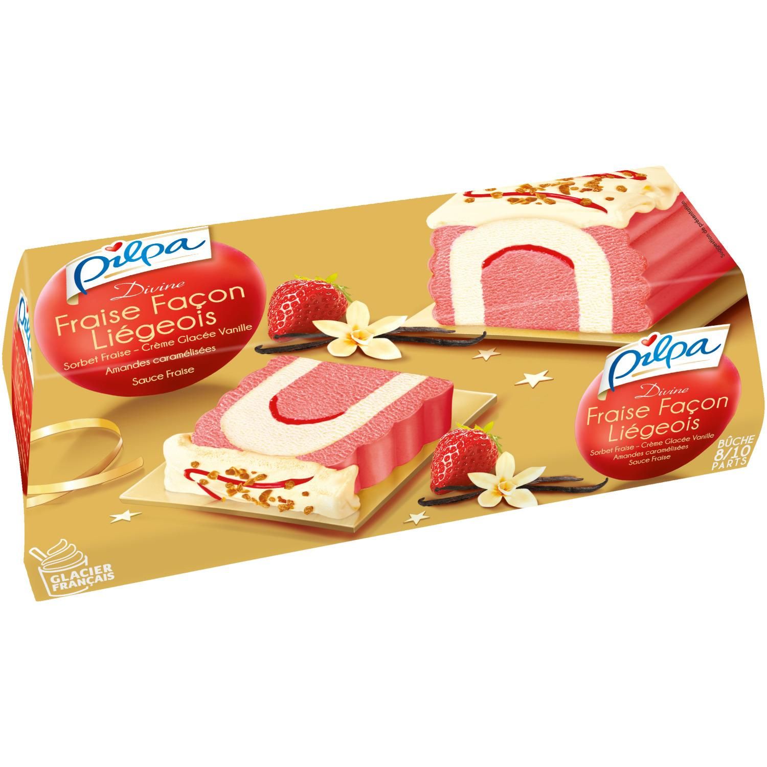 Laissez-vous tenter par la bûche fraise façon liégeoise qui allie fraîcheur, douceur et onctuosité avec un sorbet fraise, une crème glacée à la vanille et une sauce fraise saupoudrée d'amandes caramélisées pour une expérience de dégustation divine. Glacier français.