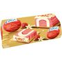 Sorbet à la fraise 48.8%, crème glacée à la vanille 42%, sauce à la fraise 8.1%, décor morceaux d'amandes caramélisées 1.1%