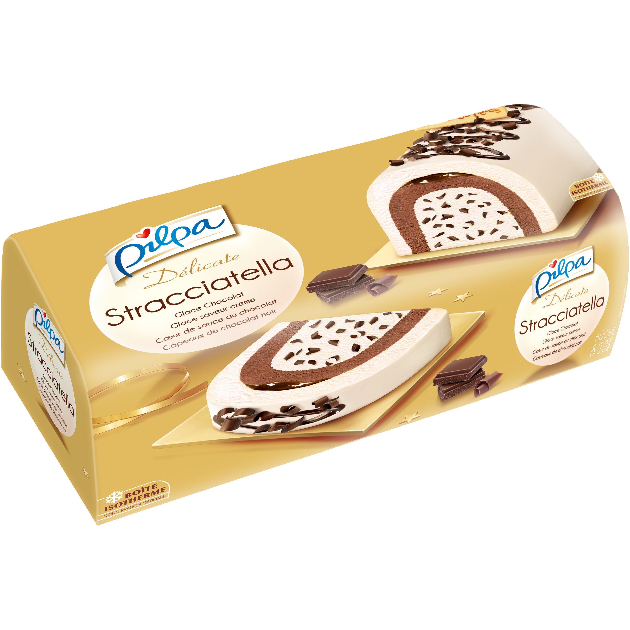 Glace saveur crème (57.5%, glace au chocolat (30.6%), sauce chocolat (8.9%) copeaux de chocolat noir (2.6%) et plaquette en chocolat blanc (0.4%). En copeaux, en sauce ou en glace, le Chocolat vient sublimer une délicieuse glace saveur Crème dans cette nouvelle bûche Stracciatella. Découvrez la recette délicate d’une spécialité italienne revisitée en dessert de Noël convivial et gourmand. Une valeur sûre pour vos fêtes de fin d’année.