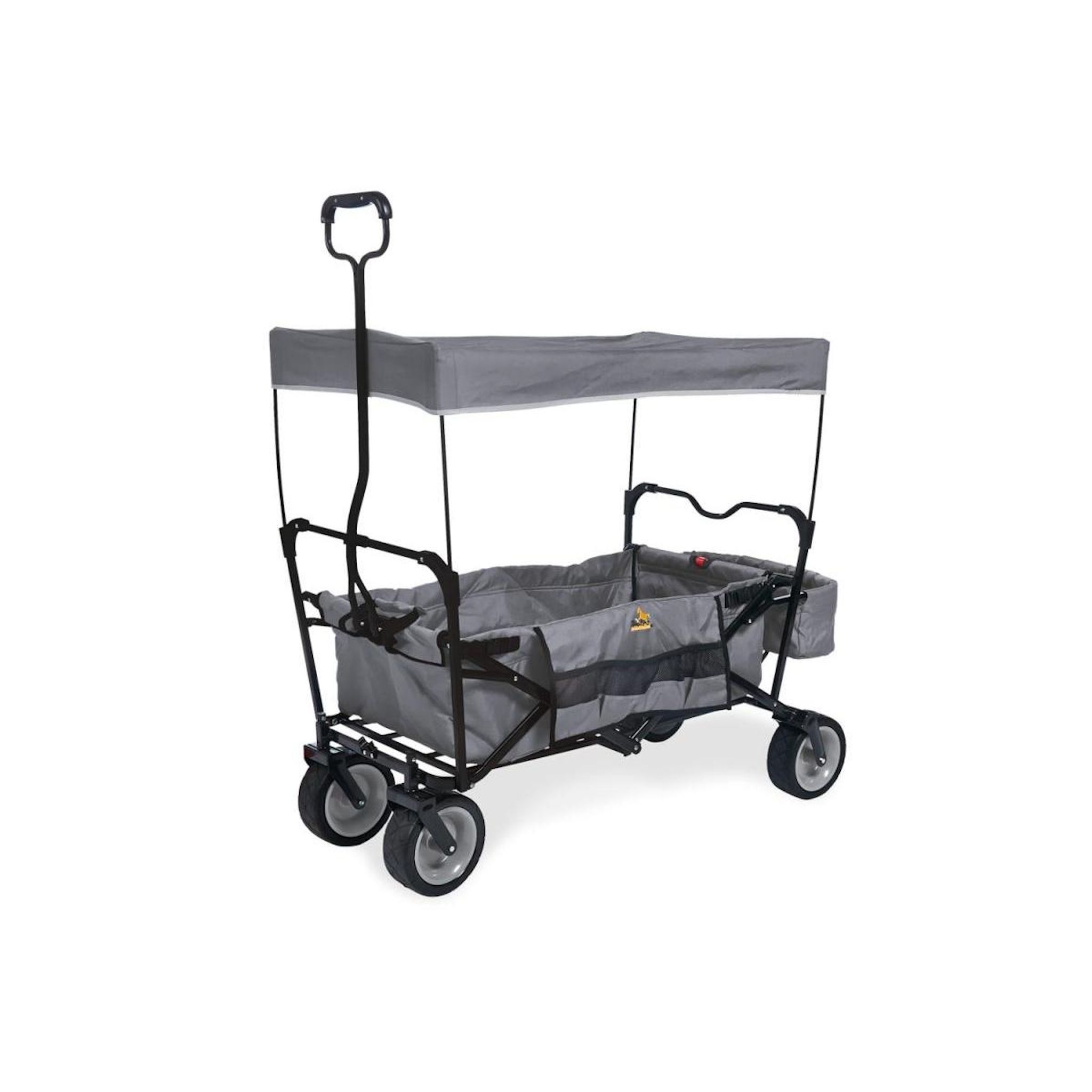Cadre en métal, peint en noir et tissu, gris. Tissu 100% PU. Incl. toit ouvrant. L 124 cm, L 59 cm, H 67 cm ou avec pare-soleil 102 cm. Pliés ensemble en quelques étapes simples, dimensions L 22 cm, L 63 cm, H 80 cm. Zone de chargement: L 86 cm, L 43 cm, H 25 cm. Pneus en PU, essieux en acier. Avec