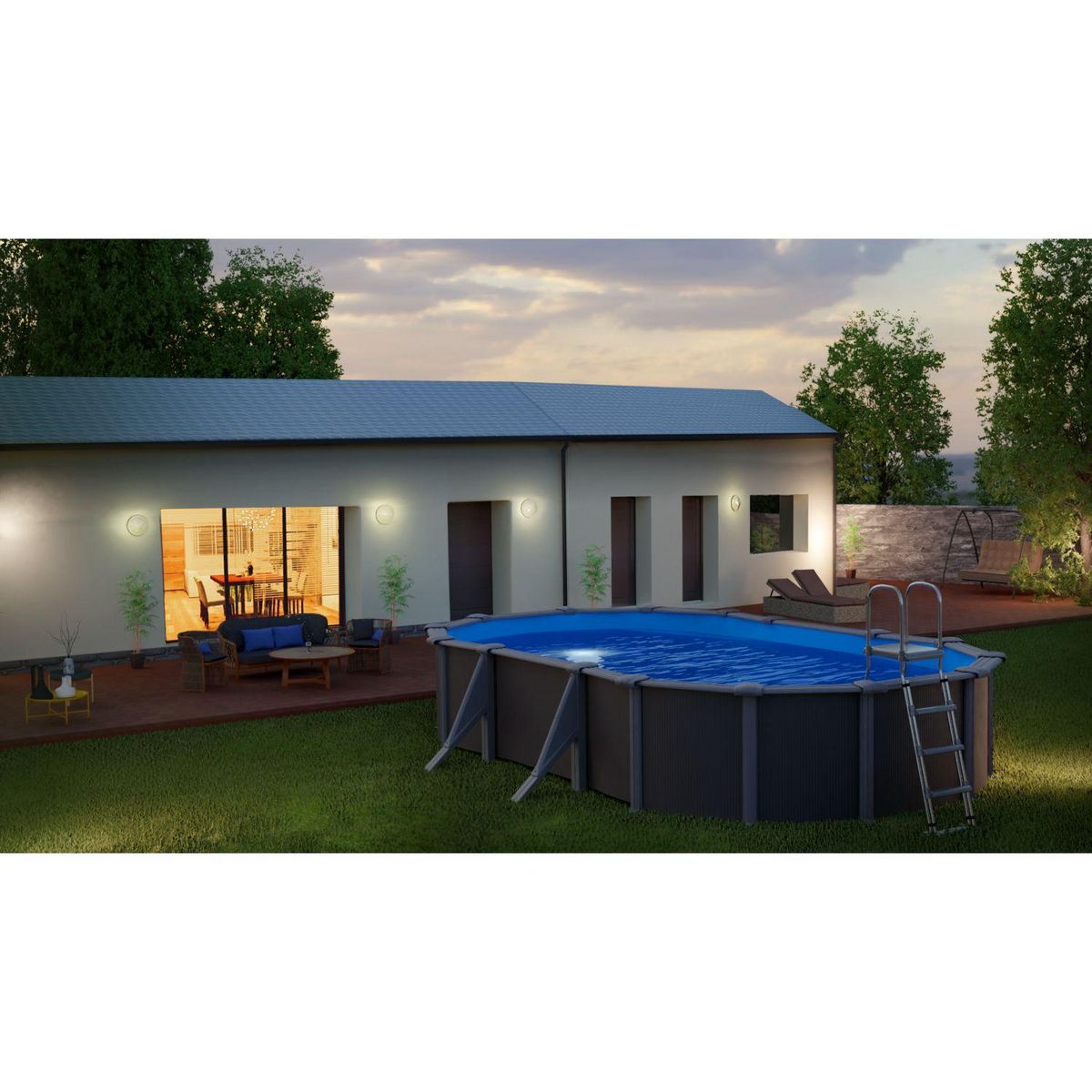 piscine ovale en acier gris anthracite 6,34m x 3,99m x h:1,22 m dimensions intérieures: 6,10m x 3,75m x h:1,20m dimensions extérieures: 6,34m x 3,99m x h: 1,22m renforts apparents structure acier imitation bois 45/100º filtration à sable 4m³/h, sable fourni volume 21m³ liner bleu 40/100e echelle de sécurité 2x3 marches garantie 5 ans sur la structure / 2 ans sur la filtration et les accessoires