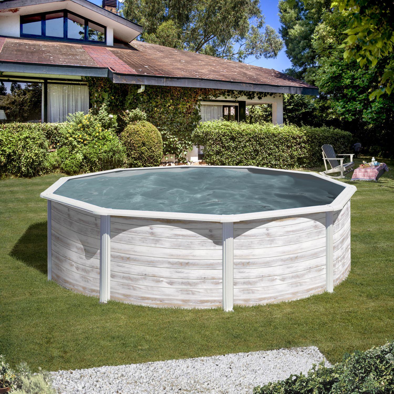 piscine ronde en acier imitation bois nordique ø4,80m x h:1,22 m dimensions intérieures: ø4,6m x h:1,20m dimensions extérieures: ø4,80m x h: 1,22m structure acier imitation bois 45/100º filtration à sable 4m³/h, sable fourni volume 17,45m³ liner gris 30/100e echelle de sécurité 2x3 marches garantie 5 ans sur la structure / 2 ans sur la filtration et les accessoires