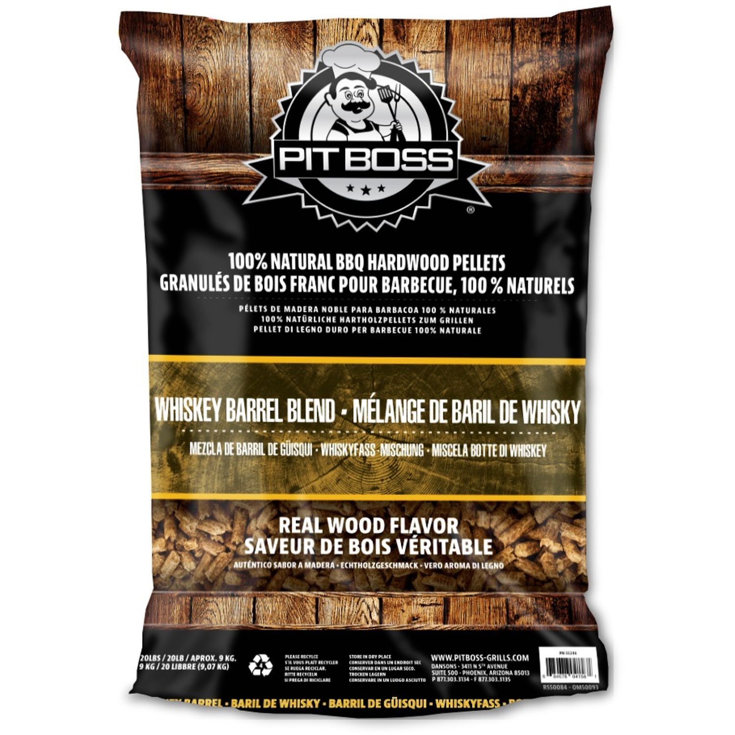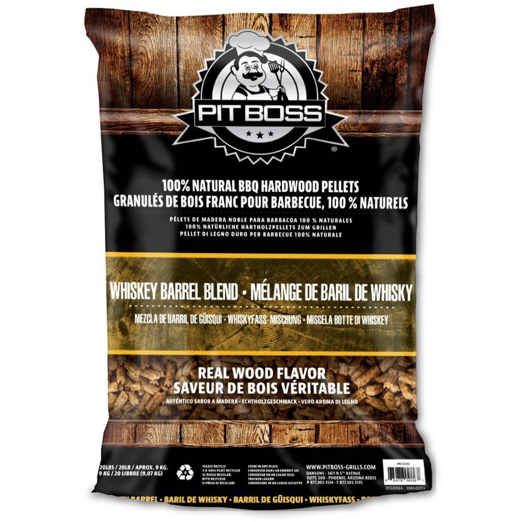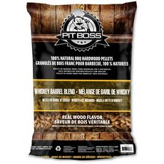 "Les granulés de bois dur Pit Boss Whiskey Barrel produisent une saveur forte et fumée idéale pour le bœuf, le gibier, le poisson et les crustacés, la volaille. Sans arômes artificiels, parfums de pulvérisation, colles ou produits chimiques : les granulés de bois franc Pit Boss sont 100 % natu