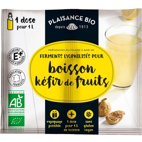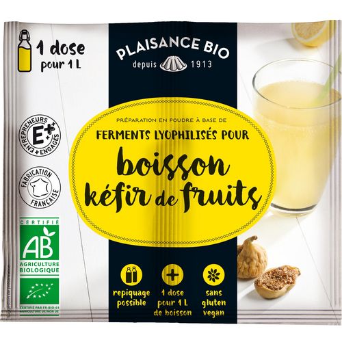 : Utiliser des ustensiles parfaitement propres. Verser la poudre dans un récipient de 1 L pouvant fermer hermétiquement. Ajouter, selon vos goûts, 1 à 2 rondelles de citron, 1 à 2 fruits secs (figue, abricot…) et 2 à 3 cuil. à soupe de sucre. Remplir votre récipient avec 1 L d’eau et bien le fermer. Laisser fermenter 48H à température ambiante (20 - 25°C). Quand le fruit sec est remonté à la surface, votre kéfir est prêt. Filtrer le contenu pour enlever les fruits et mettre votre bouteille au frais. Déguster frais. Aucun grain de kéfir ne va se former, seul un dépôt blanc va apparaître au fond de la bouteille.