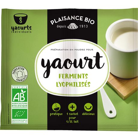 Mode d’emploi : Utilisez des ustensiles parfaitement propres, du lait UHT (ou fermier que vous aurez préalablement fait bouillir et refroidir avant utilisation). Dissoudre le ferment dans 2 cuillères à soupe de lait puis délayer petit à petit avec le restant de lait. Ajouter selon vos recettes, sucre, confiture, arômes… Verser dans des pots et mettre en yaourtière 8 à 10h selon l’appareil (se reporter à la notice du fabricant) Mettre au frais et déguster.