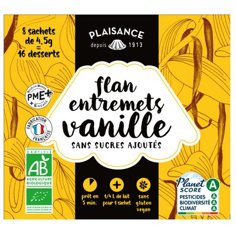 L’entremets vanille PLAISANCE BIO est garanti sans adjonction de sucre, sans gluten et sans matière d’origine animale.