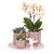 Ce coffret élégant associe une orchidée Phalaenopsis raffinée à deux succulentes vertes robustes. Les plantes sont placées dans des pots beiges modernes au design ludique et présentées sur un plateau rond. L'oiseau décoratif ajoute une touche finale charmante. Grâce à la combinaison durable de l'orc