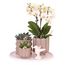 Ce coffret élégant associe une orchidée Phalaenopsis raffinée à deux succulentes vertes robustes. Les plantes sont placées dans des pots beiges modernes au design ludique et présentées sur un plateau rond. L'oiseau décoratif ajoute une touche finale charmante. Grâce à la combinaison durable de l'orchidée et des succulentes, l'ensemble reste beau longtemps et est facile à entretenir. Un cadeau parfait ou un élément décoratif pour tout intérieur.