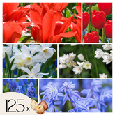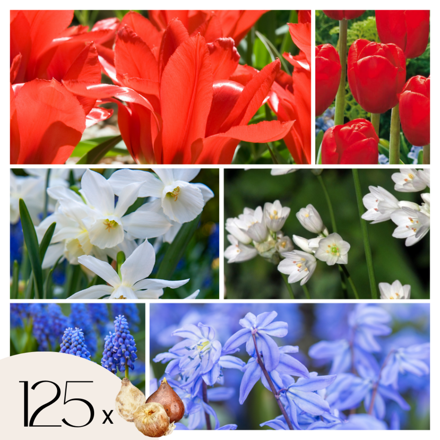 Les Bulbes de Hollande NJ sont un mélange de bulbes de fleurs de haute qualité provenant des Pays-Bas. Ce mélange se compose de six variétés différentes de bulbes à fleurs : Tulipes Triumph d'un rouge intense, Tulipes linifolia aux magnifiques fleurs étoilées, Jonquilles d'un blanc pur, Scilla siber