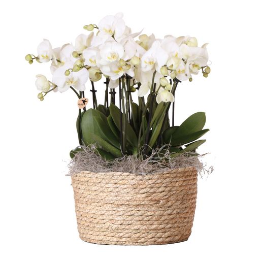 Ce coffret luxueux contient plusieurs orchidées Phalaenopsis aux magnifiques fleurs blanches, présentées avec élégance dans un panier en osier. Les grappes de fleurs riches offrent une allure élégante et intemporelle à tout intérieur. Grâce au réservoir d'eau intégré, l'entretien est facile et la plante reste belle plus longtemps. Le matériau naturel du panier apporte une touche chaleureuse et conviviale. Un cadeau superbe ou un élément décoratif pour la maison ou le bureau.