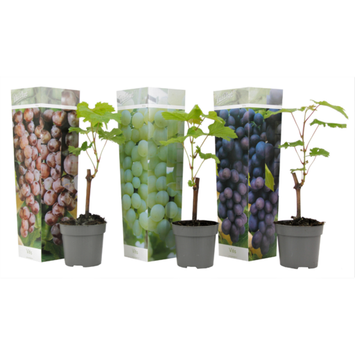Cultivez vos propres raisins avec ce magnifique mélange de trois variétés différentes de plants de raisin. Les raisins, ou officiellement « Vitis Vinifera », sont de belles plantes grimpantes rappelant la chaleur du Sud qui donneront à votre jardin ou balcon une merveilleuse atmosphère méditerranéen