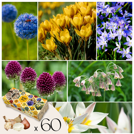 La boîte contient les bulbes suivants : Tulipa tarda-dasystemon, Crocus Goldilocks, Allium caeruleum, Allium siculum, Chionodoxa luciliae, Allium sphaerocephalon et Muscari armeniacum.