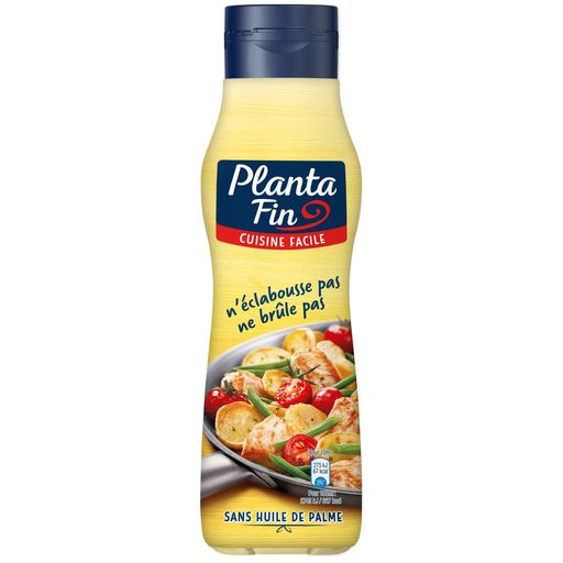 Planta Fin, l’allié gourmandise et nutrition pour toute la famille. Née en 1976, Planta Fin est reconnue pour son goût et ses recettes uniques, riches en acides gras essentiels, indispensables au développement des enfants et contribuant au bon équilibre nutritionnel de toute la famille. Planta Fin Cuisine Facile est un liquide végétal pour la cuisson contenant 79% de matière grasse, issu d'huiles 100% végétales (colza et tournesol). Sa recette est enrichie en vitamines D et contient des acides gras essentiels. En plus, elle est sans conservateur et sans huile de palme. Son format liquide malin permet non seulement une prise en main immédiate et un dosage facile, mais permet aussi de cuisiner aisément et proprement. Sa recette n'éclabousse pas et ne brûle pas, même à haute température, et préserve la saveur de vos aliments. Planta Fin Cuisine Facile peut être utilisé aussi bien pour cuire à feu doux vos aliments, que pour les dorer et les saisir. A noter, il convient d'utiliser la même quantité qu'avec du beurre et de l'huile. La température de cuisson idéale est atteinte lorsque les petites bulles commencent à disparaître. Il permet également de réaliser des pâtisseries savoureuses et gourmandes. Planta Fin Cuisine Facile existe en différents formats (500 ml et 750 ml) et variétés (Doux et Olive). Liquide végétal pour la cuisson (79% M.G.), enrichi en vitamine D.