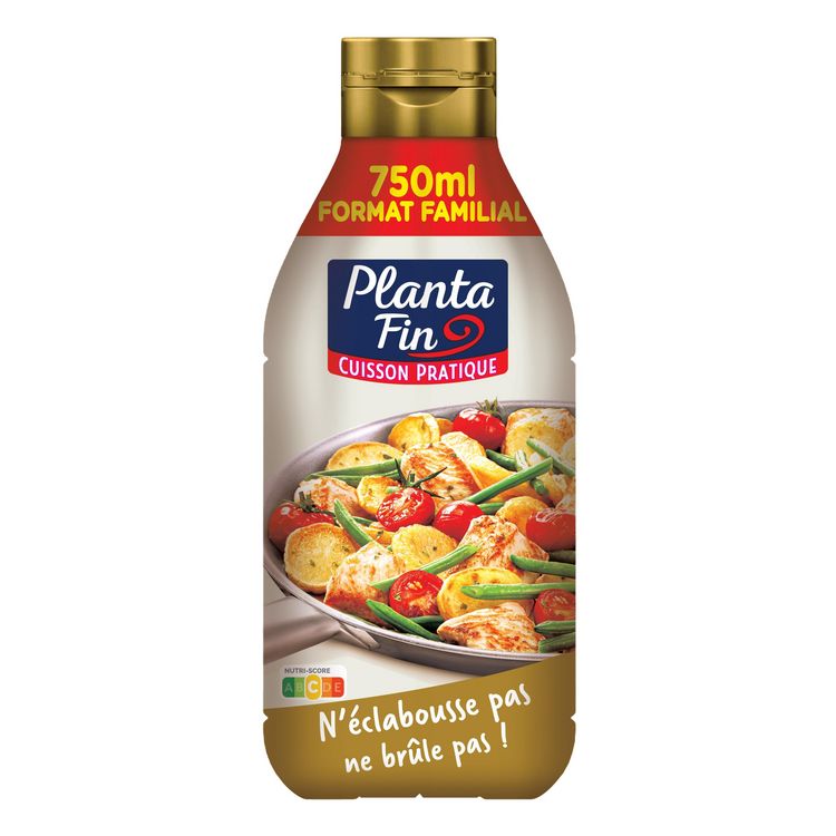 Liquide végétal pour la cuisson (79% M.G.), enrichi en vitamines D. Planta Fin Cuisine Facile est un liquide végétal pour la cuisson contenant 79% de matière grasse, issu d'huiles 100% végétales (colza et tournesol). Sa recette est enrichie en vitamines D et contient des acides gras essentiels. En plus, elle est sans conservateur et sans huile de palme. Son format liquide permet, non seulement une prise en main immédiate et un dosage facile, mais aussi de cuisiner aisément et proprement. Sa recette n'éclabousse pas et ne brûle pas, même à haute température, et préserve la saveur de vos aliments. Planta Fin Cuisine Facile peut être utilisé aussi bien pour cuire à feu doux vos aliments, que pour les dorer et les saisir.