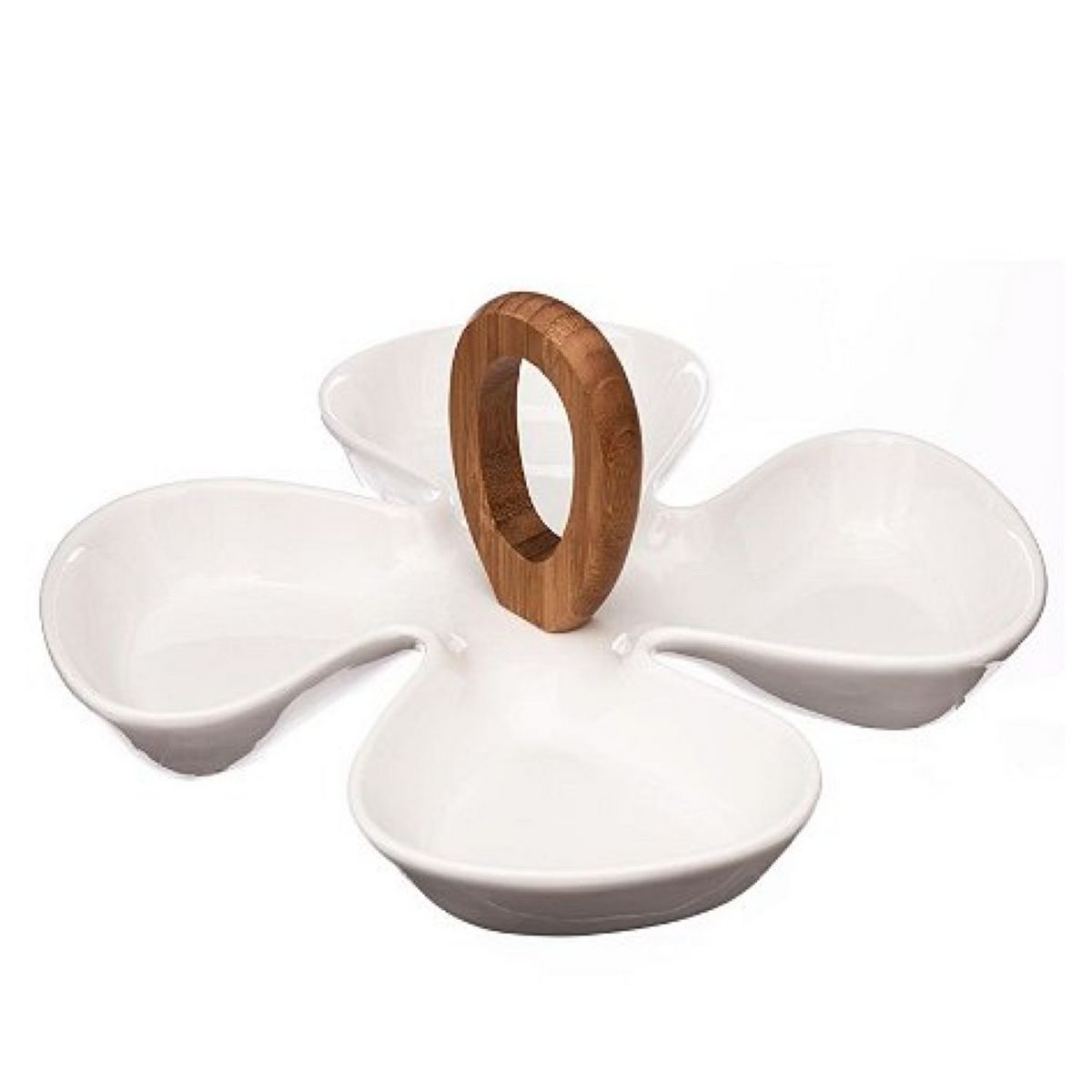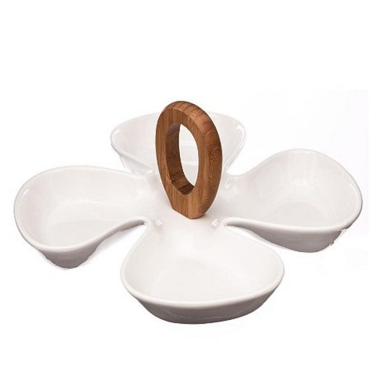 Plat apéritif 4 coupelles en porcelaine blanche avec poignée bambou. Non compatible lave-vaisselle.
