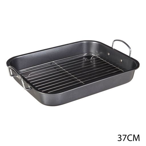 Informations Techniques : Dimensions : L. 37 x l. 28,9 x H. 5,5 cm Matière : Acier Spécificités : Tendance & Pratique Vendu avec une grille Équipé de 2 poignées en acier Revêtement anti-adhésif Poids : 0,86 kg Couleur : Gris