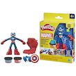 Le coffret Play-Doh Captain America propose une expérience créative pour les enfants dès 4 ans. Il comprend une figurine articulée de Captain America avec bras et jambes flexibles, ainsi qu'un bouclier tamponneur permettant de réaliser des impressions uniques en pâte à modeler. Fabriqué en plastique