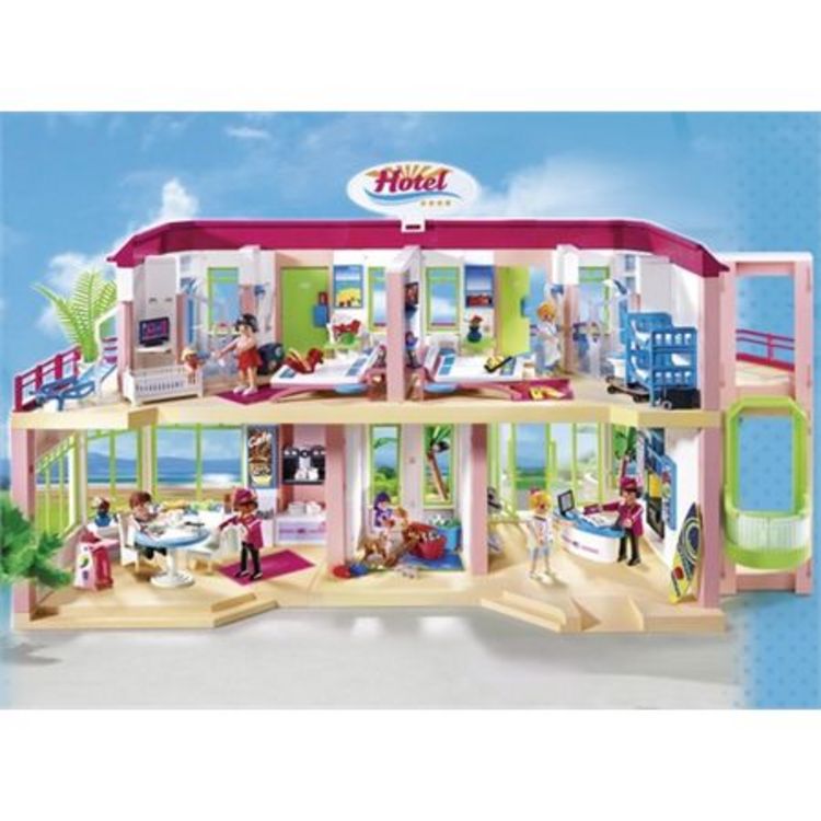 Grand Hôtel avec huit personnages et de nombreux espaces de jeux : terrasse, chambres, salle de jeux, accueil et restaurant, et de nombreux accessoires (valises, jouets, télévision, téléphone, chaise longue…)