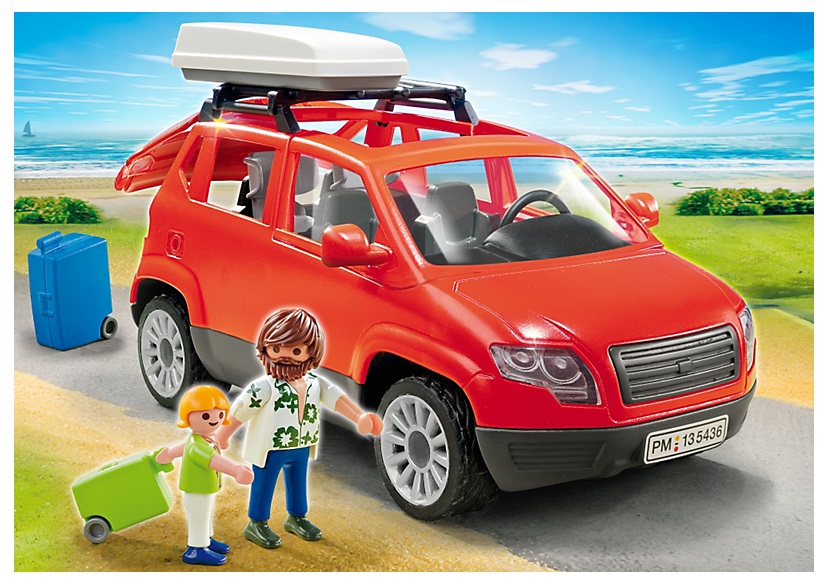 C'est le départ des vacances ! Jeanne est ravie de partir au camping avec son papa ! Pendant que Jeanne s'installe dans la voiture, son papa range les deux valises dans le coffre de toit Playmobil 5436. Départ imminent pour les vacances !