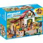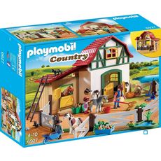 - Contient 1 bâtiment avec boxes, 3 personnages (1 adulte et 2 enfants), 3 poneys, 1 échelle, 3 barrières, d'autres animaux (chats, souris, oiseaux), des accessoires (seau, balais, brosse, carottes, abreuvoir, brouette) et de la végétation.