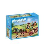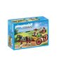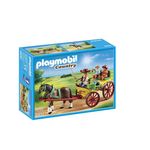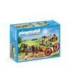 Tu aime les ballades à cheval et regarder le paysage, la Calèche avec attelage de Playmobil est faite pour toi ! L'un des personnages guide le cheval, il transporte sur sa calèche deux personnes pour une ballade. N'oubliez pas votre panier pour terminer par des courses au marché de la ville !