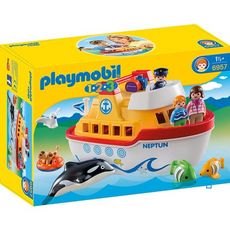 En avant ! Il est temps d'embarquer pour de grandes aventures. On prépare les valises, on rassemble la famille et les animaux et c'est parti pour une belle balade en bateau. Avec le navire transportable Playmobil 1.2.3 - 6957, les enfants pourront inventer de nombreuses histoires et ainsi développer