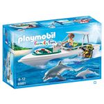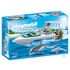 Viens nager avec les dauphins grâce au Set de Playmobil 6981 et son bateau de plongée! Les plongeurs peuvent choisir vitre, palmes, masque, tuba ou plongée bouteille. Le bateau flotte et le moteur submersible réf. 7350, réf. 5159 ou réf. 5536 peut être ajouté. Le bateau peut tracter la banane compri