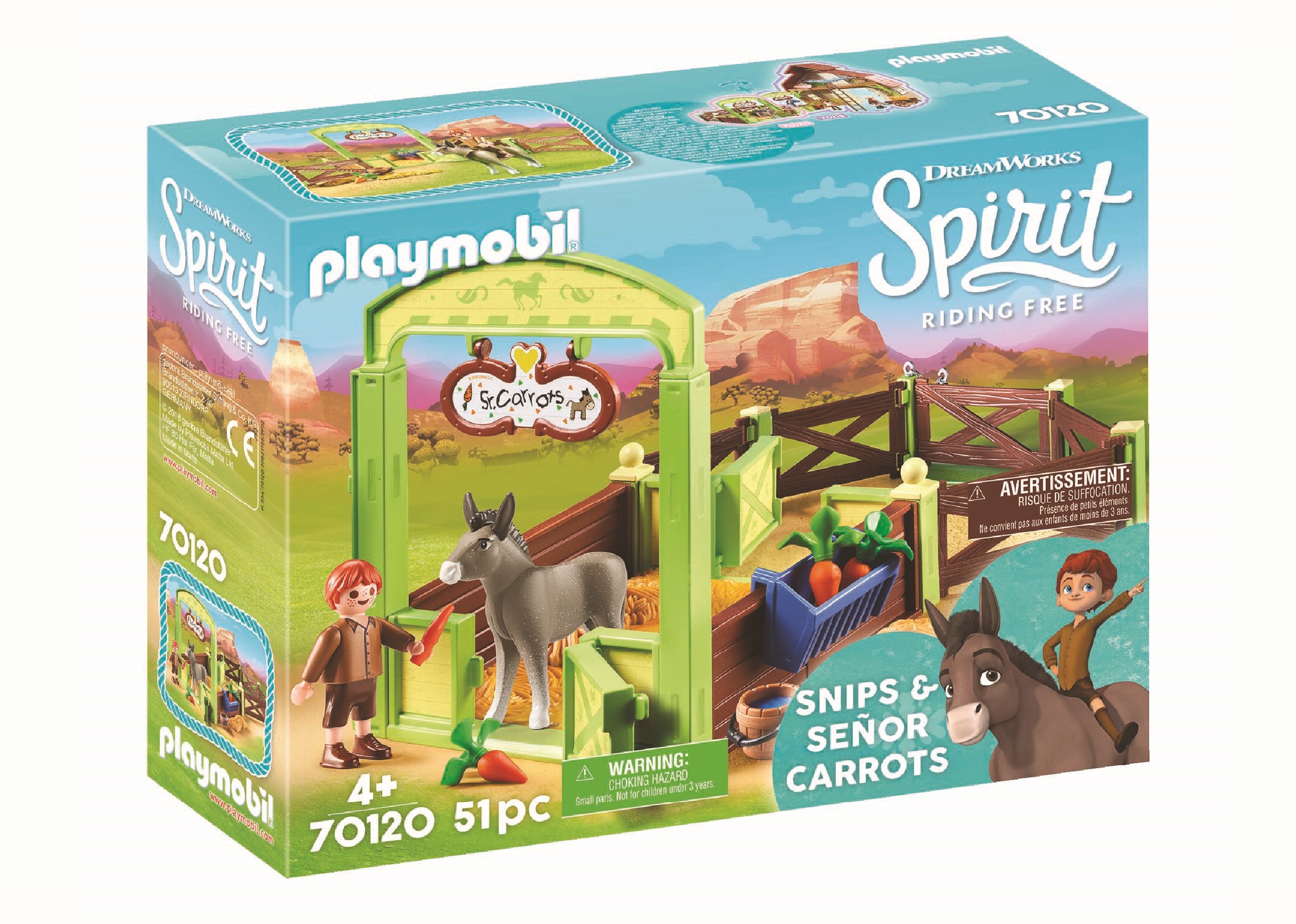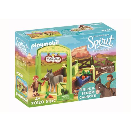 Retrouve les personnages de ton dessin animé préféré : Spirit, l'étalon des plaines. La boîte Playmobil 70120 - La mèche et Monsieur Carotte Box comprend la Mèche, le petit frère d'Abigaëlle, ainsi que M. Carotte son âne. La Mèche s'occupe de son âne, il peut lui donner à boire et à manger, ou le promener en dehors de son box.