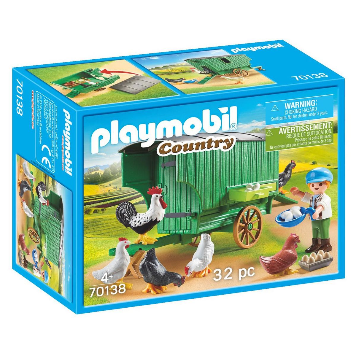 - Contient 1 personnage, 5 poules, 1 coq et des accessoires (œufs, casquette, mangeoire).