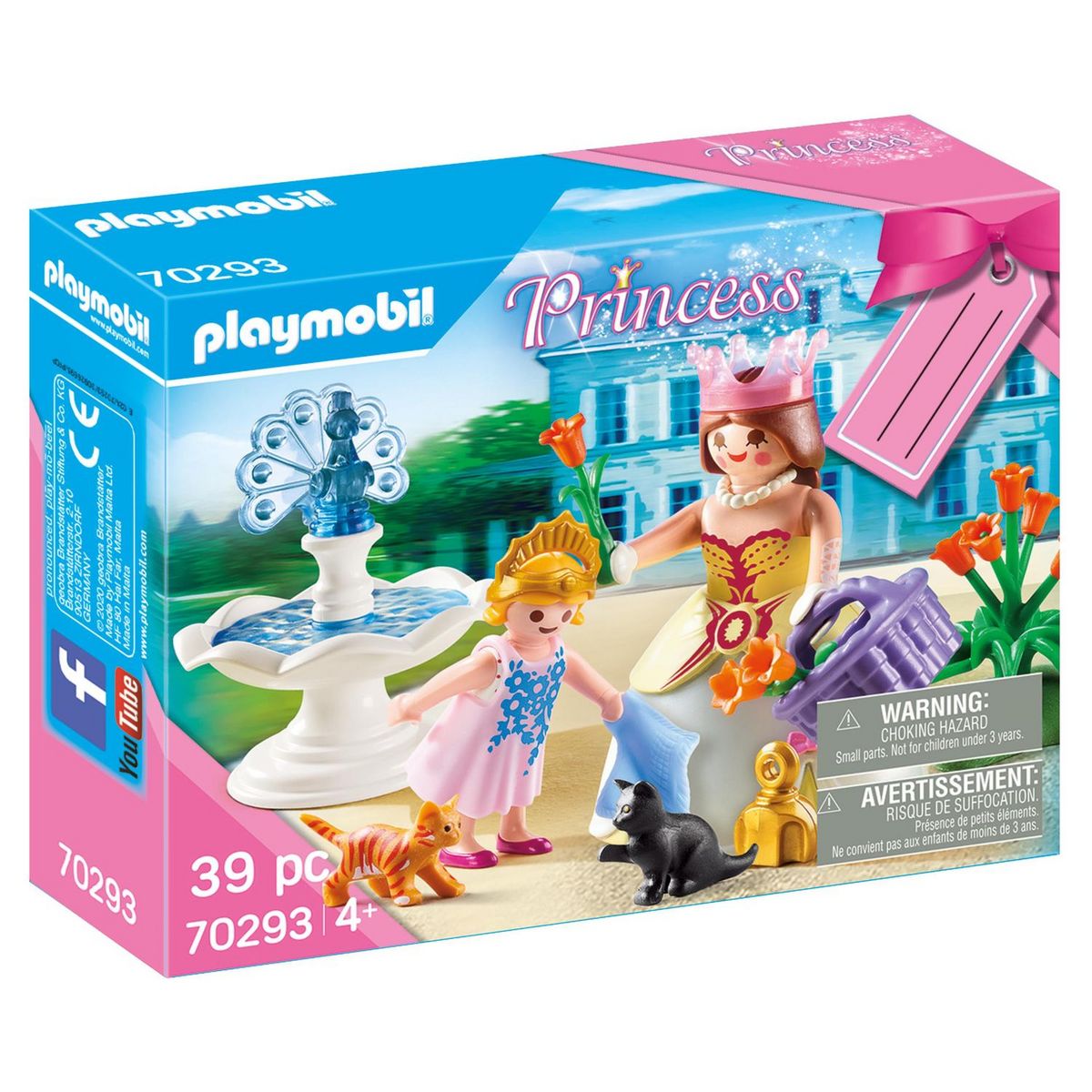 - 39 pièces dont 2 figurines Playmobil, 2 chats, 1 fontaine et d'autres accessoires (panier, fleurs, etc.).