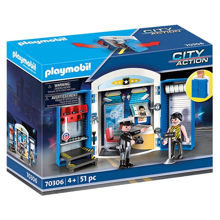 - 2 personnages PLAYMOBIL, le policier et le détenu, un appareil photo, des menottes, un bâton blanc et de nombreux autres accessoires de police.