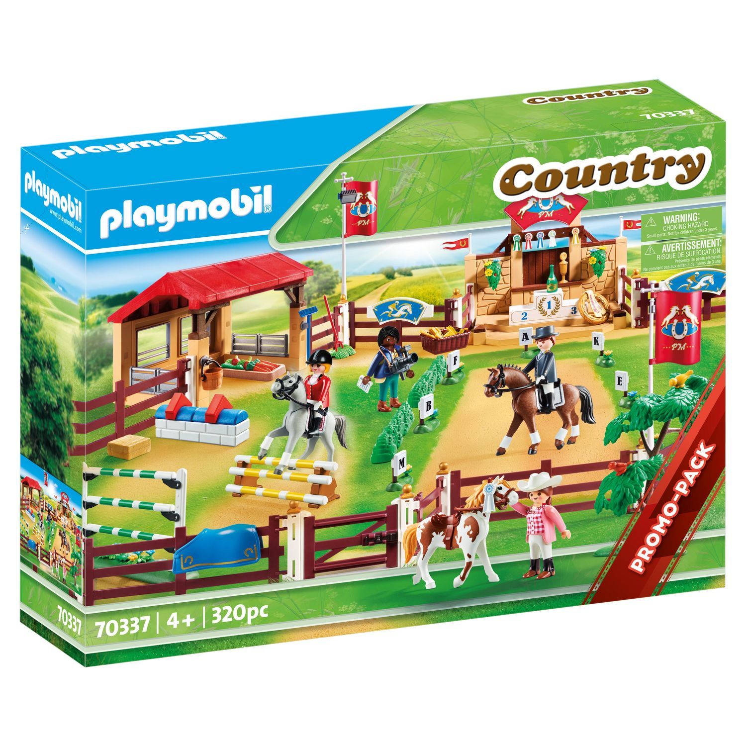 - Contient 3 personnages, 1 obstacle, 1 podium, 3 chevaux (un cheval de compétition allemand, un arabe et un pinto) et des accessoires.