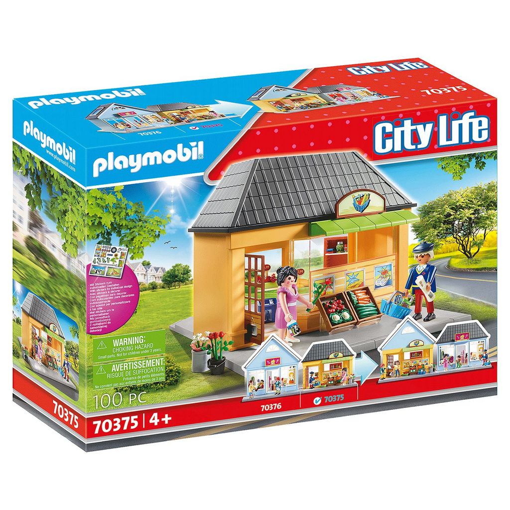 - Deux personnages PLAYMOBIL, un bâtiment magasin avec un comptoir, une caisse et des rayons, des paniers d’achats empilables, différentes sortes de fruits et légumes, des cartons de boissons et bien d’autres accessoires. Les autocollants sur la planche d’autocollants jointe peuvent être utilisés.