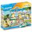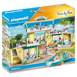 - 6 personnages PLAYMOBIL, un bâtiment principal avec la réception et le restaurant, deux bungalows avec une terrasse ensoleillée et une piscine pour enfants avec un toboggan.