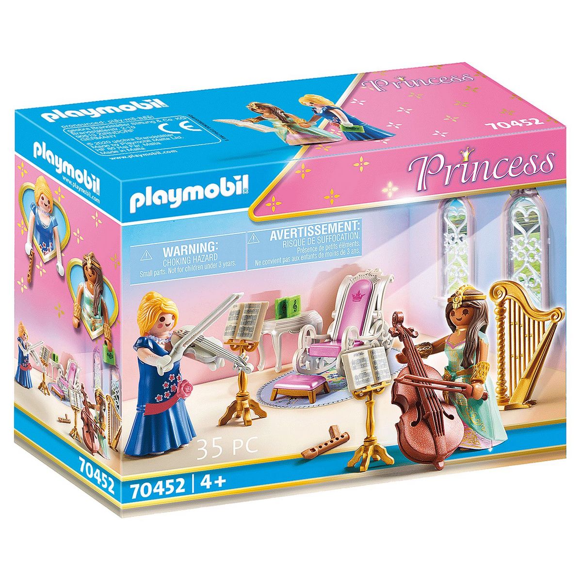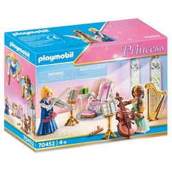 La Salle de musique du palais comprend deux personnages PLAYMOBIL, la princesse Nadja et une autre princesse, une harpe, un violon, une contrebasse, une flûte à bec, un fauteuil à bascule, deux pupitres avec des partitions et d'autres accessoires.