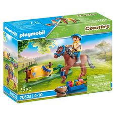 Le petit garçon prend bien soin de son poney brun. La caisse bleue contient plusieurs accessoires pour ce dernier. Un petit coup de brosse et on part faire une balade ! Contient un personnage et un poney.