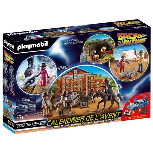 Chaque jour, ouvrez l'une des 24 petites fenêtres qui dissimulent des personnages et des accessoires PLAYMOBIL® pour s'amuser dans l'univers de Retour Vers Le Futur. Revivez les scènes du troisième opus de Retour Vers le Futur grâce à ce calendrier de l'Avent.