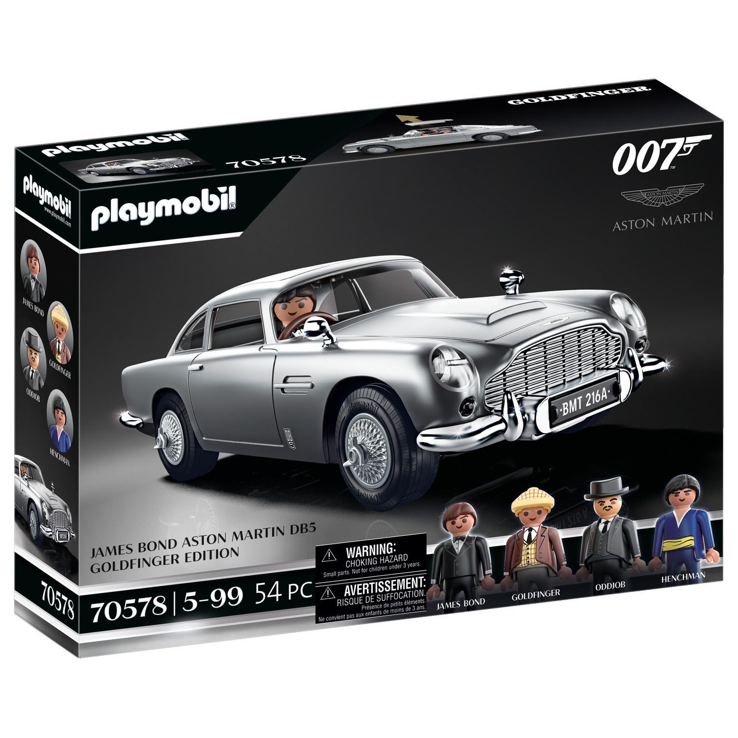 54 pièces dont 4 figurines Playmobil (dont James Bond) et des gadgets intégrés au véhicule