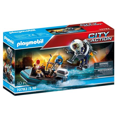 Alerte alerte ! On a besoin de renfort ! Le nouvel équipement de la police va enfin être utilisé, le voleur s'enfuit sur son canoë. Pas de temps à perdre, l'agent enfile son réacteur dorsal et part à sa poursuite ! Quelle sensation, on dirait qu'il vole !