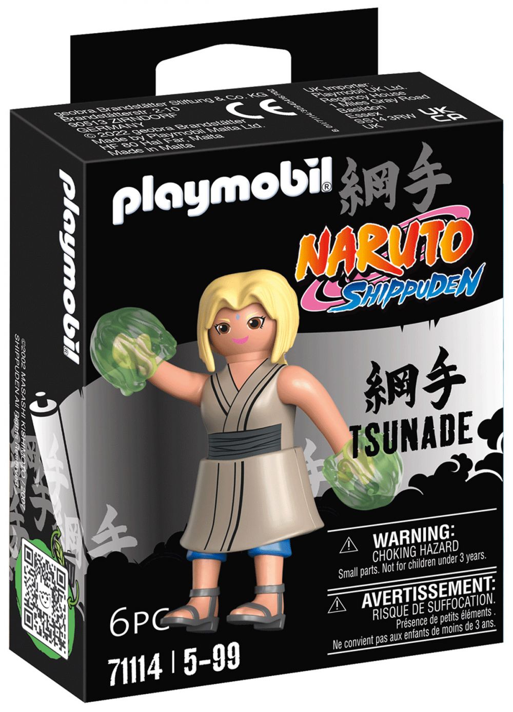 Le légendaire Sannin est surnommé le joueur malchanceux avant de devenir plus tard le cinquième Hockage. Tsunade est l'une des trois Sannin légendaires. En dépit de son statut d'Hockage, elle conserve une réputation peu glorieuse de perdante notoire fondée sur ses nombreuses défaites aux jeux. Tsunade est connue pour son caractère capricieux et affirmé mais conserve un côté sentimental. Le set de jeux Playmobil inclut le personnage de Tsunade issu de Naruto Shippuden, avec des cheveux blonds et un sigle violet sur le front. Elle porte un kimono avec une blouse grise et a deux boules de chakras avec elle. Depuis deux décennies, l'anime Naruto Shippuden ravit les fans du monde entier. Les premiers personnages originaux de cette série mythique font leur apparition chez PLAYMOBIL, juste à temps pour célébrer leur 20ème anniversaire . Grâce aux nombreux détails des figurines, les personnages conçus avec précision invitent à reconstituer des scènes légendaires et à inventer de nouvelles histoires. Un plaisir de pouvoir créer des histoires pour les fans d'anime de tous âges.