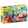 Le médecin arrive dans son ambulance pour secourir un patient, il a tout l'équipement nécessaire dans sa mallette. Pendant ce temps, le policier sécurise le lieu de l'accident et met en place un triangle de signalisation.