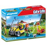 Contient 1 véhicule d'intervention spécial pour terrain de sport, 3 personnages (2 sauveteurs et un blessé) et des accessoires de premiers secours.