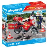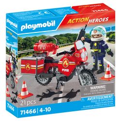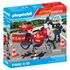 Appel d'urgence à la caserne des pompiers ! Comprend un personnage, une moto équipée d'une béquille, un extincteur, une boite à bagages et des pylônes pour sécuriser la zone dangereuse. Partez à l'aventure pour des missions de sauvetage palpitantes avec le nouveau set Le camion de pompiers et le lieu de l'accident PLAYMOBIL ! Le pompier traverse les embouteillages sur sa moto jusqu'au lieu de l'accident et sécurise la zone dangereuse avec des pylônes. Le guidon et la béquille sont mobiles et le personnage peut s'asseoir sur la moto. L'extincteur et le coffre à bagages peuvent être fixés sur le côté, derrière le siège, et transportés lorsqu'ils sont détachés. Les gants, un casque de moto avec la visière mobile et un protège-poitrine peuvent être retirés du personnage.