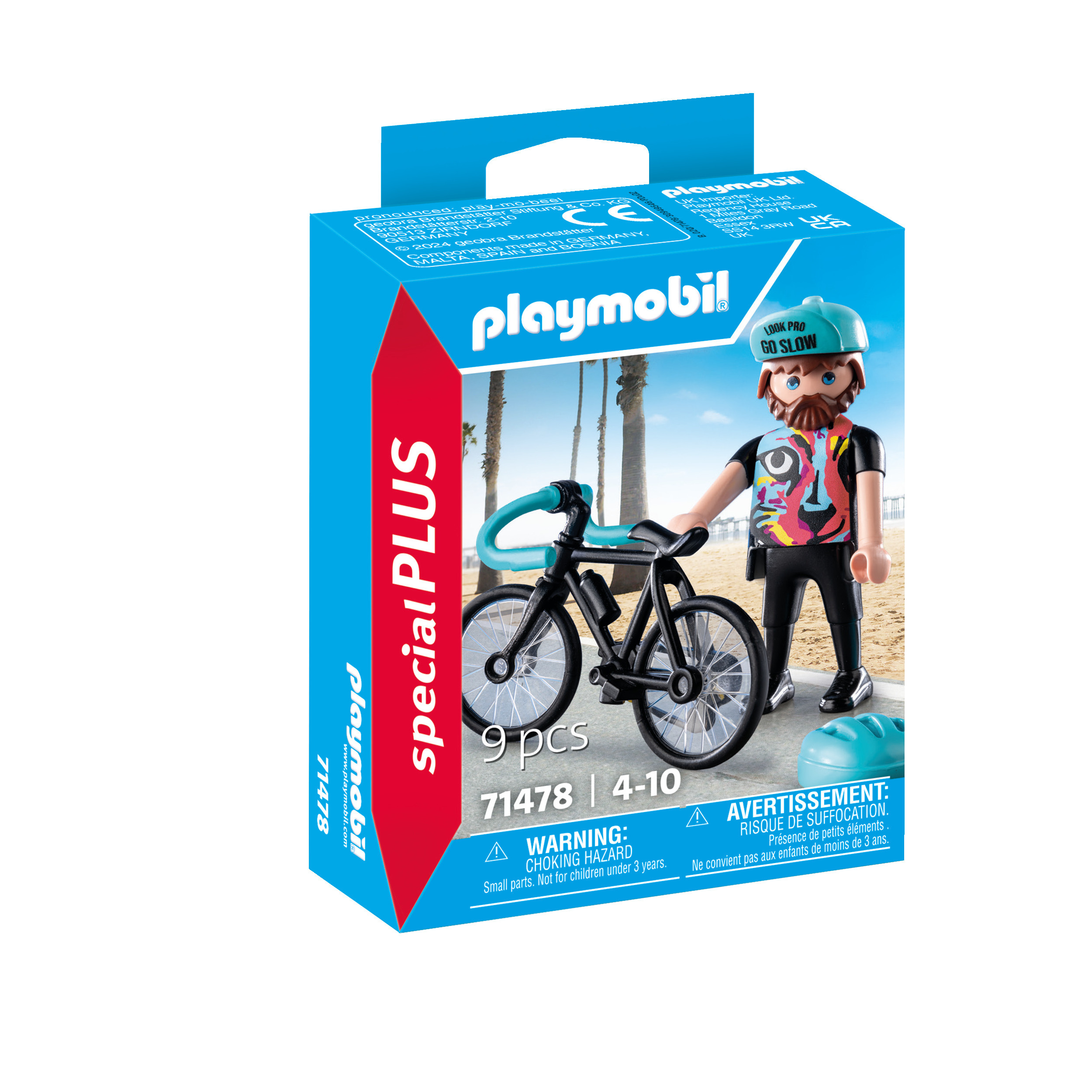 Ce set PLAYMOBIL Special Plus présente le photographe et influenceur allemand Paul Ripke. En plus de sa propre marque de mode 'PARI', Paul Ripke est principalement impliqué dans la mode, le sport et la photographie de paysage. Récemment, il s'est découvert une nouvelle passion : le cyclisme sur route. Avec son PARI CLUB HOUSE situé sur la célèbre Pacific Coast Highway à Newport, il est désormais internationalement reconnu. Le vélo de course est adapté à un personnage adulte. Deux couvre-chefs interchangeables sont fournis pour le personnage.