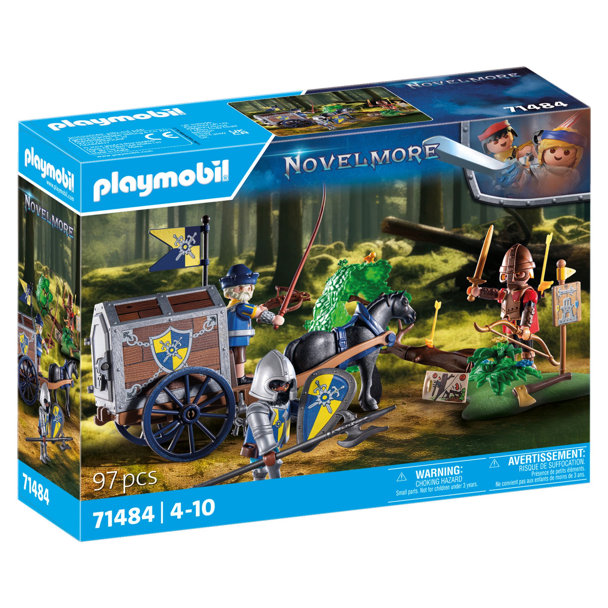 Entrez dans le monde d'aventure de Novelmore et vivez des aventures chevaleresques palpitantes avec le coffret PLAYMOBIL Convoi de Novelmore avec bandit . Avec leur chariot de transport, les chevaliers de Novelmore ont des plans secrets, mais aussi de l'or du dragon chargé. Les Burnham Raiders ont en ligne de mire cette précieuse cargaison et ont abattu un arbre pour arrêter le wagon de transport. Pourtant, les chevaliers Novelmore feront tout pour défendre leurs biens. Ce set comprend trois personnages PLAYMOBIL, un cheval, une plaque de base avec un arbre inclinable, un arc et des flèches, de l'or, une arbalète et bien d'autres accessoires. Le coffre au trésor est stocké dans la structure. La structure peut être verrouillée avec une serrure. Le cheval peut être dételé et monté sans selle par un adulte.