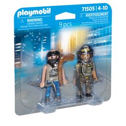 Doublez le plaisir de jouer avec le fantastique DuoPacks PLAYMOBIL : Policier et bandit. Ce set comprend un policier du SWAT avec un casque et un bandit avec un masque et des menottes. Les menottes peuvent être tenues par un personnage dans la main et permettent d'attacher un personnage ou de l'enchaîner à un autre personnage. Le masque et le casque avec la visière amovible sont amovibles.