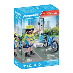 Suivez le policier dans sa patrouille à vélo électrique : entre deux interventions, il prend le temps de recharger son vélo à la station de recharge. Traversez la ville à toute vitesse avec la patrouille de police à vélo électrique PLAYMOBIL ! Équipé d'un vélo électrique élégant et d'une station de