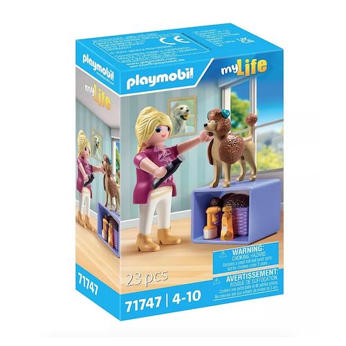 La toiletteuse canine stylise la caniche avec des outils de toilettage, rangés dans un panier. Comprend un personnage, des décorations pour le pelage et des ensembles de pelage interchangeables. Transformez l'heure du toilettage en moment de jeu avec le set de toilettage pour chien PLAYMOBIL ! Coiffez le caniche avec des ensembles de fourrure colorés, coupez et brossez son pelage, ou ajoutez des épingles décoratives pour un look chic. Le caniche peut s'asseoir, bouger la tête et passer d'un style lisse à un style duveteux pour un plaisir créatif sans fin. La table de travail et la boîte de rangement permettent d'avoir le shampoing, le séchoir et la tondeuse à portée de main.